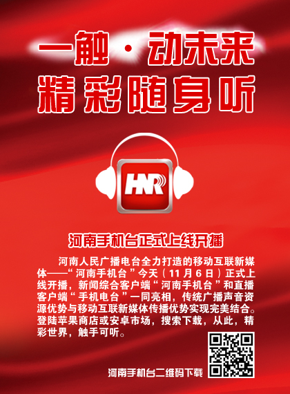 河南人民廣播電臺(tái)全力打造的移動(dòng)互聯(lián)新媒體——“河南手機(jī)臺(tái)”今天(11.6)正式上線開(kāi)播,新聞綜合客戶(hù)端“河南手機(jī)臺(tái)”和直播客戶(hù)端“手機(jī)電臺(tái)”一同亮相,傳統(tǒng)廣播聲音資源優(yōu)勢(shì)與移動(dòng)互聯(lián)新媒體傳播優(yōu)勢(shì)實(shí)現(xiàn)完美結(jié)合。登陸蘋(píng)果商店或安卓市場(chǎng),搜索下載,從此,精彩世界,觸手可聽(tīng)。