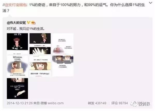這條漫畫以陳安妮自己為主角,講述的是她在別人認為只有1%成功可能的情況下,堅持畫畫、創(chuàng)業(yè)、做APP的故事。漫畫推出隨即大熱,“姚晨轉(zhuǎn)了,趙麗穎也轉(zhuǎn)了”,在短時間內(nèi)就達到了45萬轉(zhuǎn)發(fā),閱讀人數(shù)超過2億。