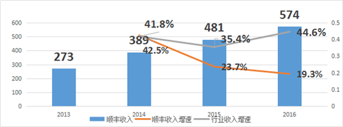 順豐在2016年的國內(nèi)快遞業(yè)務(wù)(時效產(chǎn)品,不包括其重貨、冷運、倉配業(yè)務(wù),這些也未計入郵政局快遞統(tǒng)計)收入增速只有15%左右。整體收入增速19.5%也遠遠落后于行業(yè)同期的44.6%?;乜唇陻?shù)據(jù),其增速早與行業(yè)脫節(jié),且差距拉大。在2016年低于行業(yè)25個點,低于申通圓通一半,不足中通1/3。