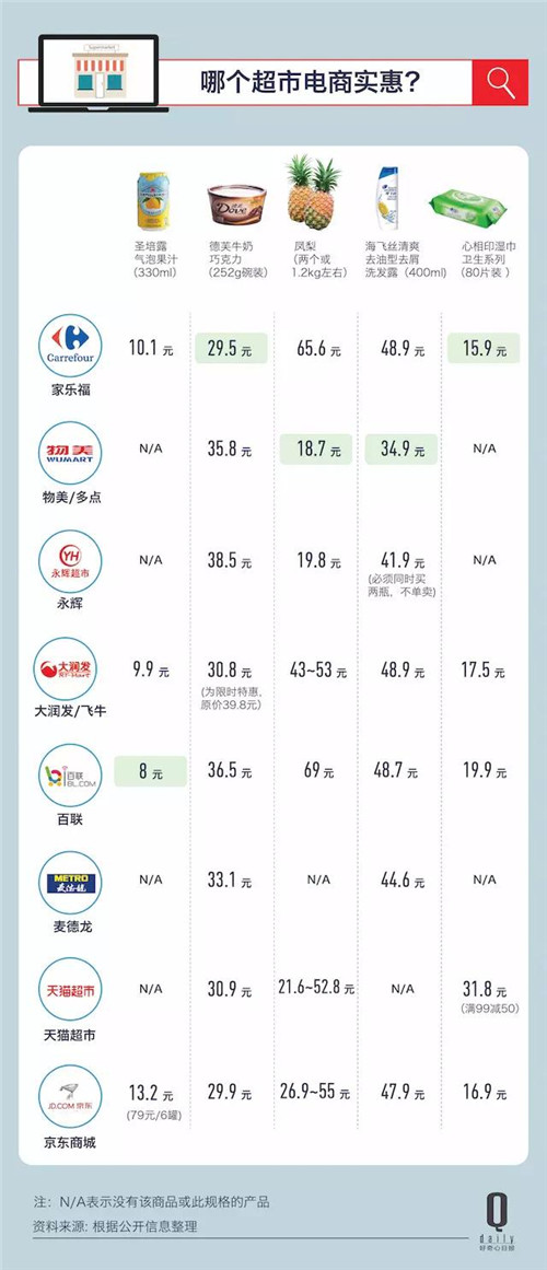 從包裝食品、進(jìn)口食品、生鮮到日化產(chǎn)品,我們隨機(jī)選擇了五個(gè)產(chǎn)品比較了一下價(jià)格。天貓超市和京東的價(jià)格優(yōu)勢(shì)不是那么明顯了。天貓超市經(jīng)常會(huì)有提價(jià)再打折的情況(知乎有不少人也反映這種情況),比如心相印濕紙巾在天貓上雖然有滿 99 減 50 的折扣,但實(shí)際上它的原價(jià)就是這款產(chǎn)品最便宜的渠道——家樂福的兩倍。從隨機(jī)抽選的 5 個(gè)產(chǎn)品來看,家樂福和物美的價(jià)格比較吸引人。