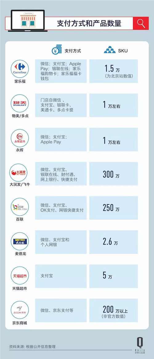 百聯(lián)電商和飛牛網(wǎng)更像京東商城或亞馬遜那樣的線上超市+百貨,SKU (據(jù)說)是百萬級(jí)別的。家樂福、麥德龍、永輝和物美/多點(diǎn)則更接近傳統(tǒng)意義上的大賣場(chǎng)超市,以食品和日化用品為主,SKU 在1~2 萬。