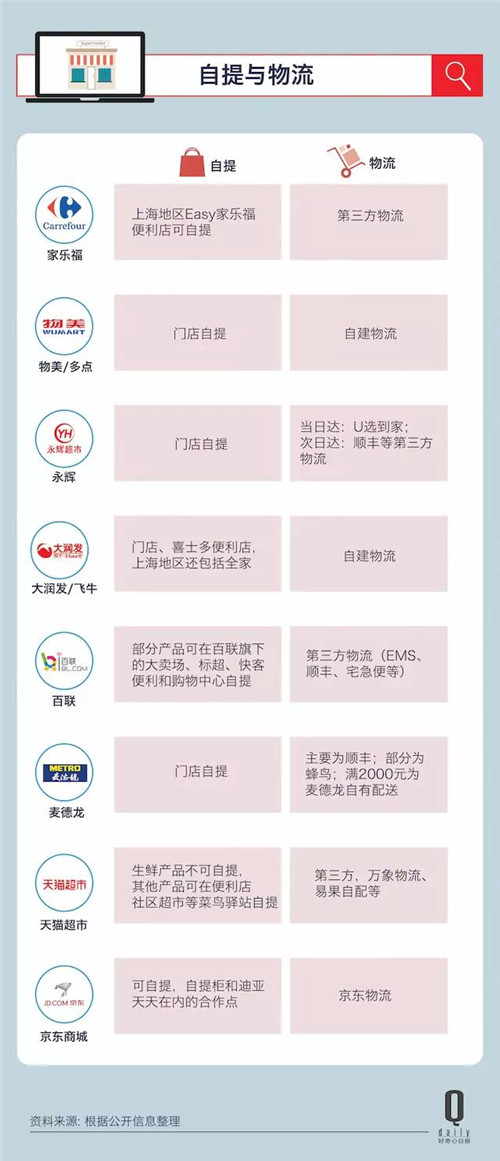 超市有線下門店這些據(jù)點(diǎn)優(yōu)勢(shì),大部分超市電商都不會(huì)漏過自提的功能。除了網(wǎng)上家樂福只能在便利店“家樂福 Easy”提貨之外(你暫時(shí)還不能在家樂福超市門店提貨),其實(shí)都是希望把客流引向線下門店。大潤(rùn)發(fā)/飛牛的自提點(diǎn)更多,除了大潤(rùn)發(fā)還有同一母公司高鑫零售旗下的喜士多,在上海它還和全家便利店建立合作,消費(fèi)者也可以在那里自提。