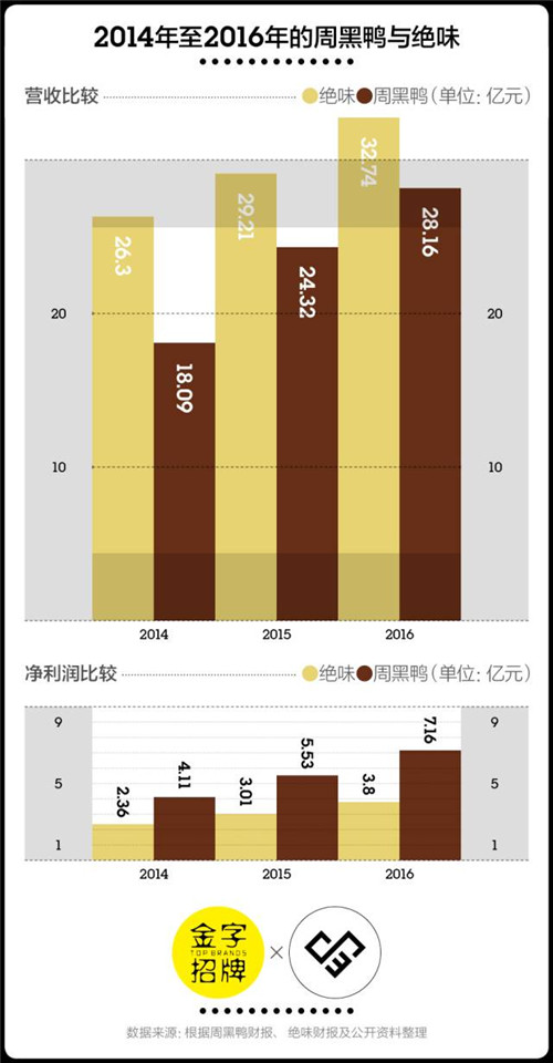 近兩年的市場表現(xiàn)沒有讓潘攀失望。根據(jù)咨詢公司弗諾斯特沙利文的數(shù)據(jù),中國休閑鹵制品零售總額從2010年的232億元增長至2016年的637億元,年均復(fù)合增長率為18.5%。截至2016年12月31日,周黑鴨全年?duì)I收約為28.16億元,較去年同期的24.32億元增長15.8%。雖然778家的門店數(shù)量只有絕味的1/10左右,但周黑鴨的利潤率是絕味的2倍多。