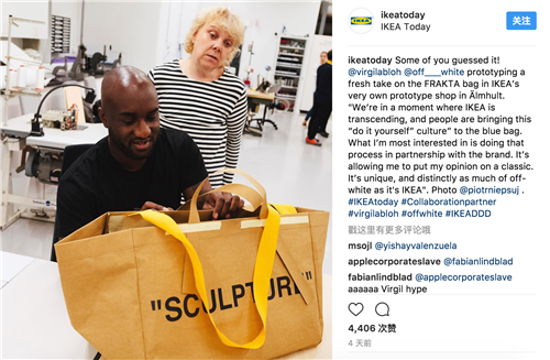 宜家宣布合作的同時(shí),還在其官方ins上面貼出了 Off-White 創(chuàng)始人兼創(chuàng)意總監(jiān) Virgil Abloh 設(shè)計(jì)的聯(lián)名 FRAKTA 購(gòu)物袋,包的一側(cè)還寫著“sculpture”。