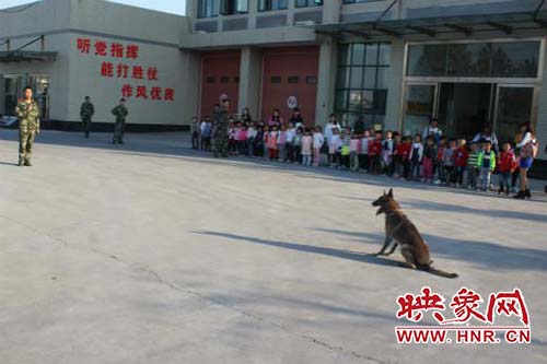 在老師和消防隊員的帶領(lǐng)下,孩子們有秩序地參觀。首先參觀了一樓車庫,孩子們被消防車以及車上的先進裝備深深吸引,消防員叔叔耐心細致地為孩子們講解消防車上的小秘密:高壓水槍、防毒面罩、氧氣瓶、急救箱、云梯、泡沫噴射槍、定位器、呼救器等消防裝備,使孩子們開了眼界。消防隊員還用淺顯的語言向孩子們介紹了消防常識:火災(zāi)的危害、火災(zāi)的預(yù)防、火災(zāi)發(fā)生時的逃生自救、消防器械的使用、消防服的穿戴等等。接著孩子們參觀了二樓的消防員宿舍、圖書室、會議室、體育活動室等,更深入地了解了消防員的學(xué)習(xí)生活,更加走近消防員。最后,消防員為孩子們帶來了精彩的警犬搜救表演,孩子們興高采烈,不約而同為消防員叔叔鼓掌叫好!