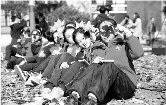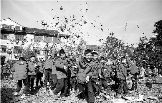 中午,當(dāng)錢(qián)報(bào)記者趕到學(xué)校時(shí),被眼前的景象驚到了:150米的環(huán)形操場(chǎng)中間,鋪滿了金黃色的落葉,一群學(xué)生正把落葉滿滿地捧起,再高高地往上一拋,于是只見(jiàn)滿眼的落葉紛飛……