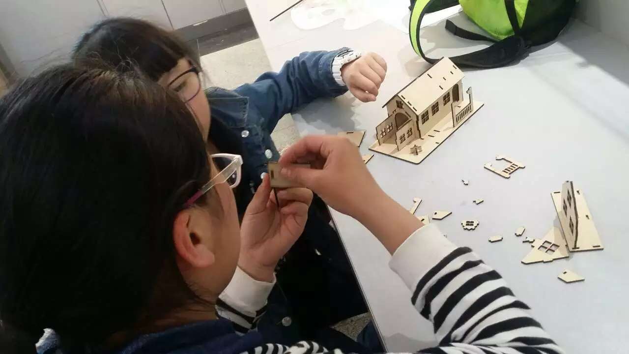 在激光加工區(qū),用激光機(jī)切割而成的大小不一、形狀各異的零件引起了同學(xué)們的興趣。同學(xué)們齊心協(xié)力,將一個(gè)個(gè)零件拼裝成了房屋模型??粗粭潡潉e墅呈現(xiàn)在眼前,孩子們歡呼雀躍,體驗(yàn)著動(dòng)手動(dòng)腦的樂趣,感受著成功的喜悅。