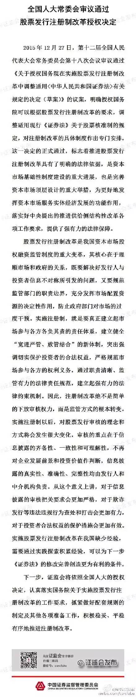 點(diǎn)評:這里說的“實(shí)施期限為兩年”,不是說注冊制只搞兩年。而是說,在《證券法》正式修行完成之前,這種人大授權(quán)方式下的注冊制,只搞兩年。兩年之后,《證券法》就修訂完成了,將來法律規(guī)定的制度就是注冊制。