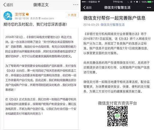 22日,支付寶官方微博發(fā)表聲明稱,“支付寶將在《辦法》出臺后正式啟動相關(guān)系統(tǒng)升級與改造工作,并且?guī)椭脩暨M(jìn)行相關(guān)操作?!?5日中午,微信支付在其官方賬號“微信支付智慧生活”發(fā)布了題為《微信支付幫你一起完善賬戶信息》的短文。