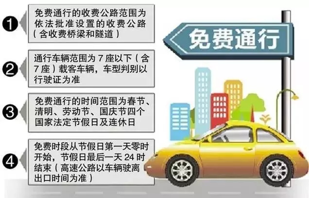 根據(jù)《重大節(jié)假日免收小型客車通行費(fèi)實(shí)施方案》,高速公路免費(fèi)通行的的具體政策如下:(一)免費(fèi)通行的時(shí)間范圍為春節(jié)、清明節(jié)、勞動節(jié)、國慶節(jié)等四個(gè)國家法定節(jié)假日,以及當(dāng)年國務(wù)院辦公廳文件確定的上述法定節(jié)假日連休日。免費(fèi)時(shí)段從節(jié)假日第一天00:00開始,節(jié)假日最后一天24:00結(jié)束(普通公路以車輛通過收費(fèi)站收費(fèi)車道的時(shí)間為準(zhǔn),高速公路以車輛駛離出口收費(fèi)車道的時(shí)間為準(zhǔn))。