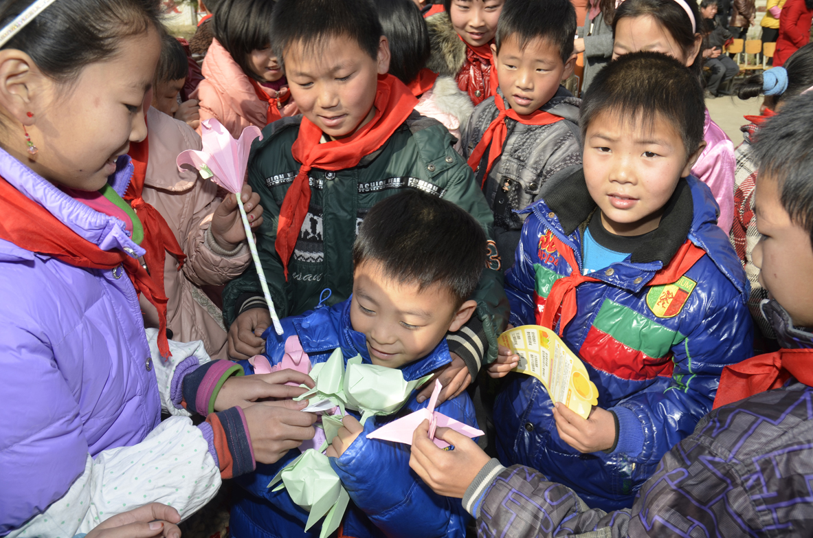 活動(dòng)結(jié)束后,懂得感恩的學(xué)生現(xiàn)場為愛心車友演唱了《感恩的心》,并為城里的小朋友送上了自己疊的千紙鶴、百合花等折紙,善良淳樸的孩子還為城里的小朋友送上了山里的土特產(chǎn),花生、紅薯、蓮藕等,一袋袋的塞到小朋友手里,在場的家長看到,感慨的說:“山里孩子很純真、很善良。”