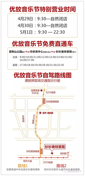 鄭州火車站:乘坐地鐵1號線至市體育中心站,可以在紫荊山公園西門,乘坐優(yōu)放音樂節(jié)免費班車。