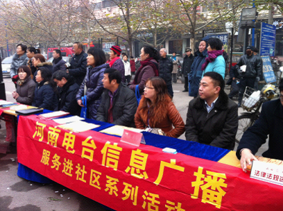 2011年12月2日(全國法制宣傳日前夕)河南人民廣播電臺信息廣播聯(lián)合建中街道辦事處在碧波園舉行了法制服務(wù)進(jìn)社區(qū)活動?;顒俞槍θ嗣袢罕婈P(guān)心的生活問題、需要法治解決的現(xiàn)實問題,從情理、道理、法理以及憲法、法律、法規(guī)等等方面給予指導(dǎo),通過答問題之疑、解法律之惑,真正為人民群眾排憂解難。使法制宣傳教育深入人心,認(rèn)同法治精神,接受法治理念,共創(chuàng)和諧社會。