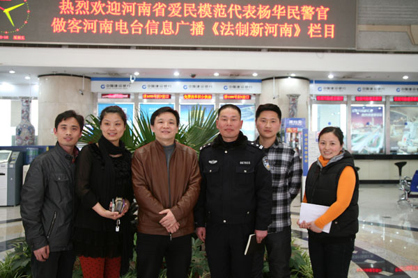 2012年3月16日下午四點(diǎn),中央電視臺(tái)攝制組進(jìn)入河南電臺(tái)信息廣播《法制新河南》節(jié)目直播間進(jìn)行了拍攝。在節(jié)目中做客的是全國(guó)愛民模范鄭州市花園路農(nóng)業(yè)路楊華民交通示范標(biāo)準(zhǔn)崗崗長(zhǎng)楊華民。