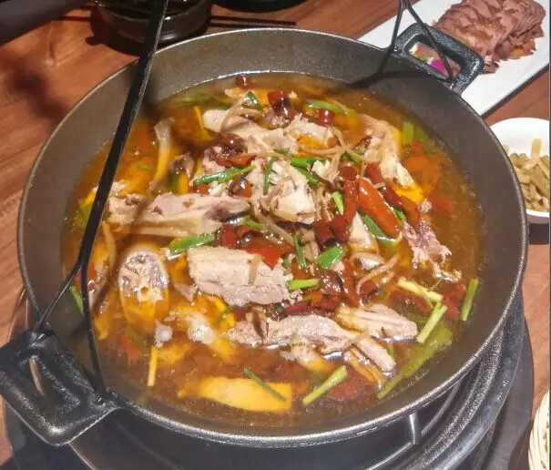 這鍋也不是普通鍋,必是生鐵的才好,一是厚重,鍋不會(huì)亂動(dòng),二是健康,補(bǔ)鐵補(bǔ)血,比廣告強(qiáng)。鍋內(nèi)放信陽老燉菜,老公雞、排骨、豬蹄、鵝塊,時(shí)間越久越有味。如果是冬天,“新醅酒,小火爐,天欲雪,一杯無”意境太贊,要是夏天,“炭火燒,大汗淌,赤膊上,可勁浪”,警察叔叔也管不著~~
