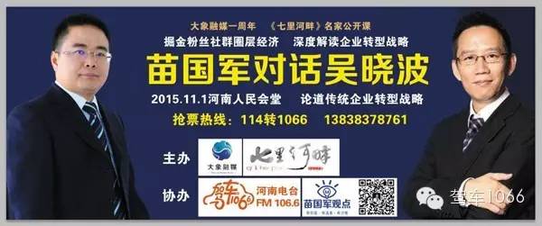 對(duì)話吳曉波,作為關(guān)注社會(huì),運(yùn)籌帷幄的社會(huì)精英怎會(huì)不心動(dòng)?你想提問(wèn)嗎?在微信平臺(tái)“駕車(chē)1066”留下您的問(wèn)題,苗國(guó)軍將把您的精彩問(wèn)題帶到現(xiàn)場(chǎng)。