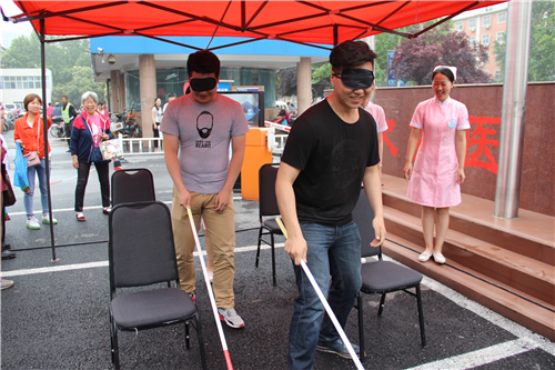義診活動(dòng)現(xiàn)場,還舉行盲人體驗(yàn)活動(dòng),邀請市民戴上眼罩模擬盲人參加各種游戲,以體驗(yàn)健康視力的寶貴。