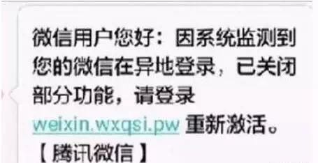 #最新詐騙手法#【收到微信帳號(hào)異地登錄短信時(shí)要警惕!】近期很多人收到這樣的短信:“微信用戶您好:因系統(tǒng)監(jiān)測(cè)到您的已微信在異地登錄,并已關(guān)閉部分功能,請(qǐng)登錄weixin.wxqsi.pw重新激活。【騰訊微信】”。廳哥提醒:這其實(shí)是一個(gè)由偽基站發(fā)來(lái)的詐騙短信,一旦打開(kāi)鏈接,很有可能被誘導(dǎo)輸入微信帳號(hào)、微信密碼、支付密碼、驗(yàn)證碼等,后果不堪設(shè)想……