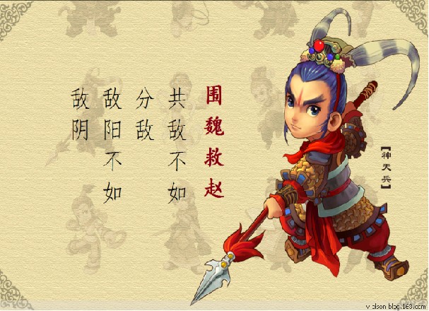 譯文:攻打兵力集中的敵人,不如設(shè)法使它分散兵力而后各個(gè)擊破;正面攻擊敵人,不如迂回攻擊其薄弱空虛的環(huán)節(jié)。本指圍攻魏國的都城以解救趙國。后指襲擊敵人后方的據(jù)點(diǎn)以迫使進(jìn)攻之?dāng)吵吠说膽?zhàn)術(shù)?,F(xiàn)借指用包超敵人的后方來迫使它撤兵的戰(zhàn)術(shù)。