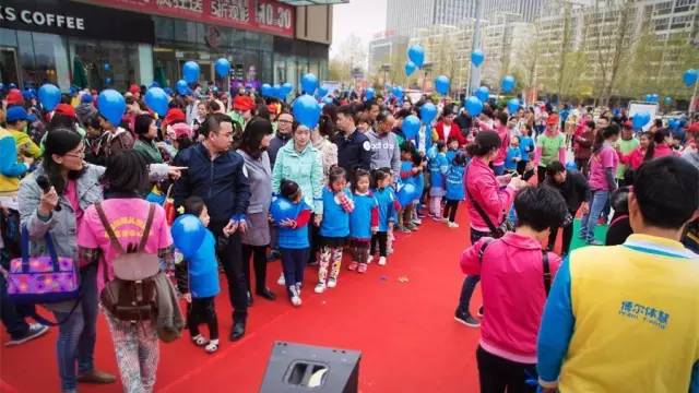 除了有藍(lán)色的氣球外,每個參與活動的人都穿著藍(lán)色的服裝,頭戴藍(lán)色帽子,手系藍(lán)色絲帶,整個活動現(xiàn)場成了一片藍(lán)色的海洋。