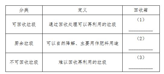 請(qǐng)你根據(jù)生活常識(shí),將以下垃圾填入上表對(duì)應(yīng)的“回收箱”類別中。①?gòu)U燈管 ②瓷磚瓦片 ③香蕉皮 ④剩菜剩飯 ⑤喝過(guò)的茶葉 ⑥過(guò)期藥品 ⑦廢塑料袋 ⑧廢玻璃