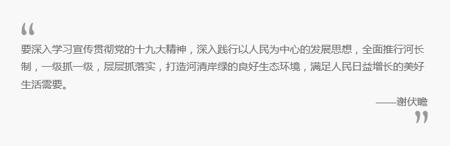 謝伏瞻指出,我們要認(rèn)真學(xué)習(xí)宣傳貫徹十九大精神,按照省委省政府制定的方案,全面落實(shí)河長制,強(qiáng)化屬地責(zé)任,健全長效機(jī)制,細(xì)化措施辦法,嚴(yán)格追責(zé)問責(zé),保護(hù)水資源,治理水污染,修復(fù)水生態(tài)。各級領(lǐng)導(dǎo)要負(fù)責(zé),各項(xiàng)制度要落地,各級政府要投入,各項(xiàng)工作要扎實(shí),合力攻堅(jiān),真正形成人人參與、共建共享的良好局面。