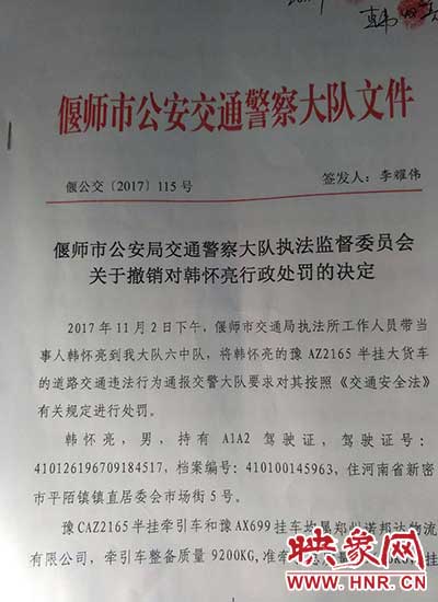 因處罰決定書存在明顯的問題,偃師市公安局交警大隊認識到自己的錯誤。12月16日,偃師市公安局交警大隊,決定撤銷【2017】410321-2900412916號處罰決定書。12月17日上午,偃師交警大隊派法制科黎科長和督察李警官趕到鄭州,找韓先生退錢。