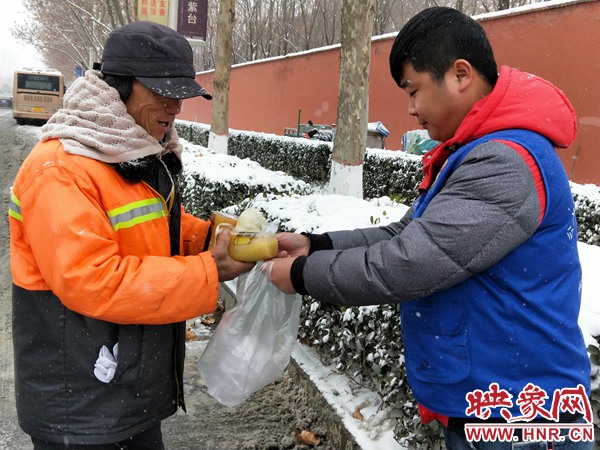 早上開(kāi)車路過(guò)的二公司79路車長(zhǎng)張鵬輝看到環(huán)衛(wèi)工奮力除雪的情景,中午下班后悄悄地和同事買了40個(gè)包子和20杯小米粥驅(qū)車到文化路北四環(huán)送到環(huán)衛(wèi)工手中。