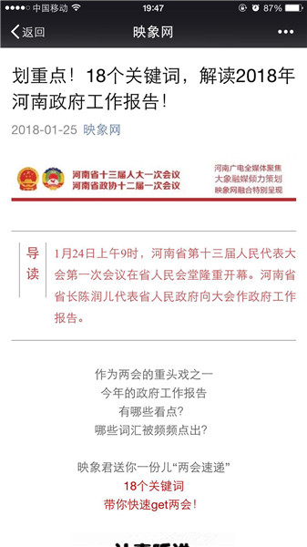 映象網(wǎng)官方微信策劃推出原創(chuàng)策劃《河南人,2018給你穩(wěn)穩(wěn)的幸福!》、《你好,我是河南!這是我的五年成績單,請接收!》、《2018年,河南都有哪些“小目標(biāo)”?》、《劃重點(diǎn)!18個(gè)關(guān)鍵詞,解讀2018年河南政府工作報(bào)告!》。每篇都刷屏朋友圈,網(wǎng)友積極轉(zhuǎn)發(fā)點(diǎn)贊,稱“看完真的覺著穩(wěn)穩(wěn)的幸?!薄?/p>