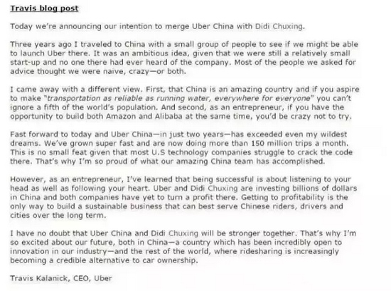 今天我們宣布,我們打算讓優(yōu)步中國(Uber China)與滴滴出行進行合并。