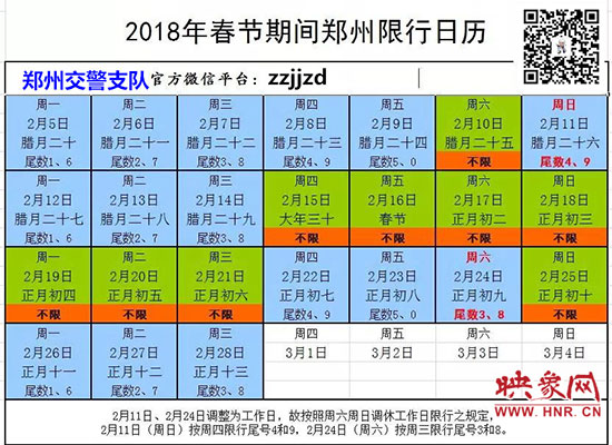映象網訊(記者 秦雯)2018年春節(jié)長假從2月15日開始至2月21日結束,共7天,春節(jié)將至,為了確保在市民人流、車流、物流最密集的時段可以安全出行。2月5日,記者從鄭州市交警支隊了解到:2月15日至2月21日春節(jié)七天長假期間,鄭州市區(qū)三環(huán)以內所有機動車尾號不限行,但2月11日(星期日)、2月24日(星期六)上班,因法定節(jié)假日放假調休而調整為上班的周六、周日,按對應調休的工作日限行,因此2月11日(周日)按周四限行規(guī)定,限行尾號4和9;2月24日(周六)按周三限行規(guī)定,限行尾號3和8。