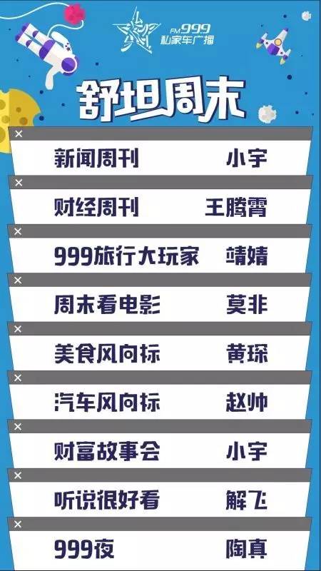 新聞周刊、財(cái)經(jīng)周刊、財(cái)富故事會(huì)、聽說(shuō)很好看、美食風(fēng)向標(biāo)、汽車風(fēng)向標(biāo)……周末的生活,就得這么舒坦,就得這么輕松有料。短小趣味的節(jié)目,不同屬性的內(nèi)容,你要音樂,還是資訊,我們這里全部都有。