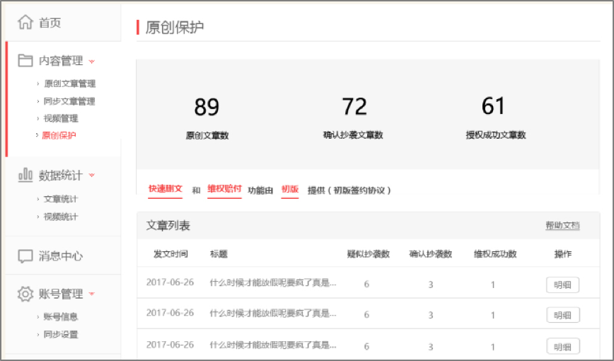 一點號、鳳凰號為自媒體用戶提供原創(chuàng)文章版權保護功能。 其中,鳳凰號將于月末開啟維權賠付功能,通過后臺監(jiān)測200+主流平臺,對侵權抄襲行為一查到底替作者維權。未來一點號、鳳凰號將會全力打造原創(chuàng)優(yōu)質內容的版權保護平臺及監(jiān)測網(wǎng)絡,對于站內文章被站外的抄襲也會進行相關維權工作。