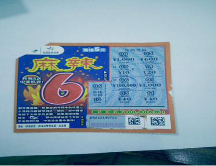 “麻辣6”玩法簡(jiǎn)單。刮開(kāi)覆蓋膜,如果你的號(hào)碼中的任意一個(gè)號(hào)碼與中獎(jiǎng)號(hào)碼之一相同,即中得該號(hào)碼下方所示的金額;如果出現(xiàn)辣椒標(biāo)志,即中得該標(biāo)志下方所示金額的6倍。獎(jiǎng)金兼中兼得。(李棟)