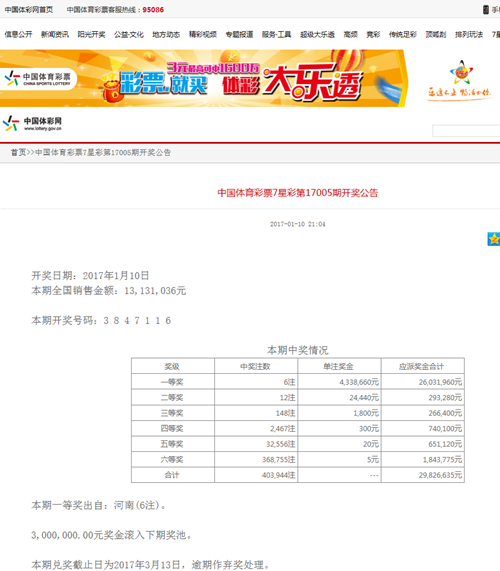1月10日晚,七星彩第17005期開獎(jiǎng),開獎(jiǎng)號碼為3847116。當(dāng)期全國中出一等獎(jiǎng)6注,單注獎(jiǎng)金433.86萬元,全部被河南彩民斬獲,總獎(jiǎng)金2600余萬元,一次性掏空了全國獎(jiǎng)池。