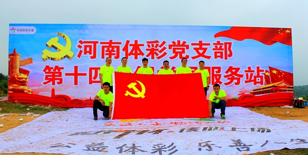 參賽者路過(guò)“河南體彩黨支部第十四小組黨員服務(wù)站”