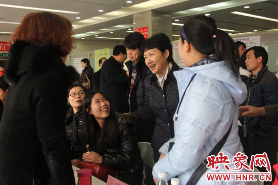 河南省婦聯(lián)副主席庫鳳霞與現(xiàn)場導(dǎo)師以及求職者交流