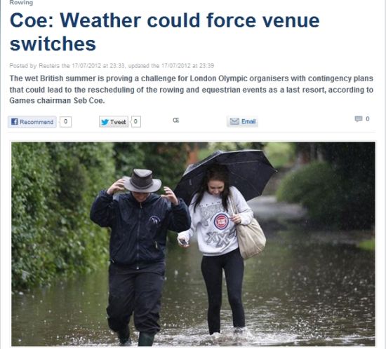 英國奧委會主席塞巴斯蒂安-科表示,降雨已對后勤方面造成很大的問題,而盡快想出應對方法和緊急方案也被提上日程。他同時承認,賽艇比賽和馬術比賽是本屆奧運會比賽的兩個主要室外項目,而由于場地構造這兩個地點非常容易受陰雨天氣的影響。