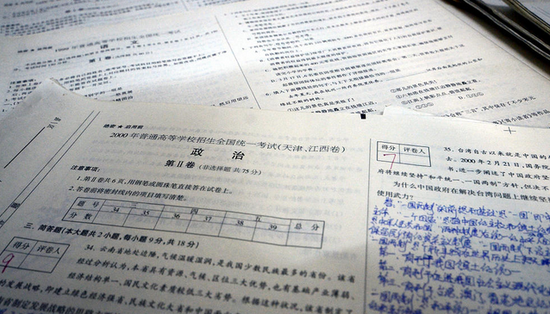 甘福保說,收藏高考試卷是一種情懷,他會一直堅(jiān)持下去。圖為甘福保收藏的高考試卷。