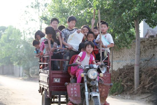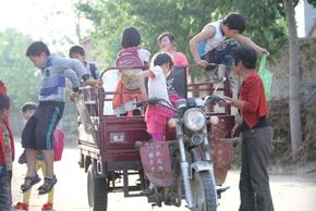 三輪摩托車開進鄭開大道南邊的一個村子停了下來。此時,我才發(fā)現(xiàn)真正在駕駛三輪摩托車的是一位中年婦女,那個貌似在開車的小女孩就坐在三輪摩托車的油箱上。為了看清道路,中年婦女不得不歪著腦袋開車。車子停下時,車上的孩子們紛紛跳下車向家中跑去。