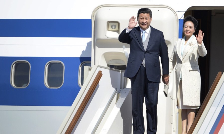 2015年5月8日,習(xí)近平和彭麗媛乘專機抵達(dá)俄羅斯首都莫斯科。