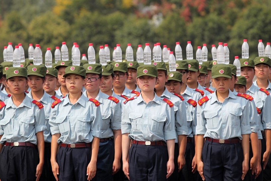 2015年9月17日,河南鄭州航空工業(yè)管理學(xué)院進(jìn)行新生軍訓(xùn),記者軍訓(xùn)現(xiàn)場(chǎng)發(fā)現(xiàn),該院在站軍姿、踢正步等軍訓(xùn)項(xiàng)目上,引入卷尺、純凈水瓶等“裝備”,而且為“準(zhǔn)空姐”訓(xùn)練的科目中,還增加了如何盤發(fā)等項(xiàng)目。圖為2015年9月17日,鄭州航空工業(yè)管理學(xué)院的新生在頭頂?shù)V泉水瓶站軍姿。
