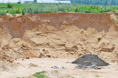 本報(bào)訊崖沙燕筑巢,工地停工保護(hù)。新鄭這一幕人與燕子和諧共處的情景曾被廣泛報(bào)道,但昨天上午大河報(bào)記者在新鄭市一處建筑工地看到,此前人鳥(niǎo)和諧共處的場(chǎng)景已經(jīng)不再,偌大一堆含有刺鼻藥味的垃圾堆在成千上萬(wàn)個(gè)燕子窩下方,記者在此蹲守近四個(gè)小時(shí),發(fā)現(xiàn)很少有燕子歸巢。