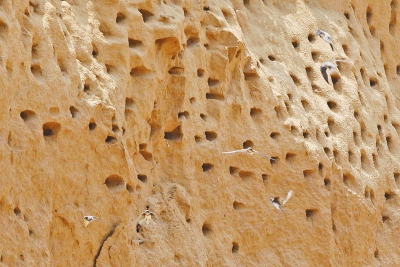 記者在現(xiàn)場(chǎng)看到,堆壁上崖沙燕的小洞穴似拳頭大小,密密麻麻,難以數(shù)清。天空中,不少小燕子正在“苦練”飛翔,嘰嘰喳喳的鳴叫聲此起彼伏;洞穴里,嗷嗷待哺的燕寶寶好奇地伸頭張望,透過(guò)攝影記者的長(zhǎng)鏡頭,記者觀察到,好多洞穴內(nèi)還有燕子喂食小燕的暖心畫(huà)面。