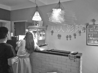“影院的小包間適合2~4人,大的最多可坐8人?!蓖砩?0點(diǎn),所設(shè)5個包間已全部滿員,包間都為不帶窗木門,均可反鎖。“候影廳”內(nèi)設(shè)置有新片推介板、爆米花機(jī)和各式酒水,不少年輕男女正排隊等待觀影。