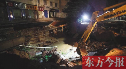 事件:疑為地下自來水管漏水加上暴雨,發(fā)生塌方,“4人墜坑兩人獲救”,另兩人一直在搜救中