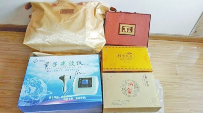 記者在經(jīng)三路和緯二路交叉口一小區(qū)內(nèi),見到了劉大媽領(lǐng)回的禮品。除大米、食用油、蜂蜜、刀具外,劉大媽還領(lǐng)了保健鞋、軟玉墊、治療儀、金碗筷,以及向天果、靈芝口服液保健品。其中僅兩盒口服液商家要了1萬元,其余全為贈品。劉大媽老伴說,他咨詢了專業(yè)人士,贈品加起來不值幾百元,口服液在藥店一盒也僅售幾百元,而在網(wǎng)上類似于靈芝口服液的產(chǎn)品一盒只要100多元。他拿起商家送的金碗,用手一摳,表層金黃色便被摳掉。