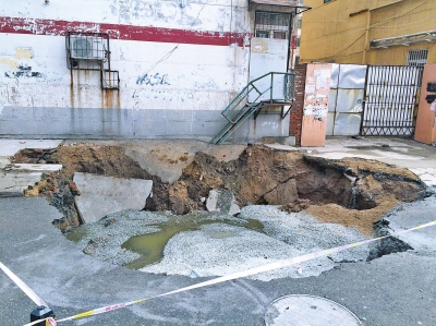 王先生說,今年7月,該處的供水管道曾爆管過一次,但當時該處只發(fā)生一次小范圍塌陷,坑也沒這么深。沒想到,時隔2個月,該處再次管道爆裂、地面塌陷。