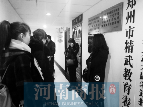 學(xué)生家長(zhǎng)們?cè)谂嘤?xùn)班門前,商量怎么找到負(fù)責(zé)人
