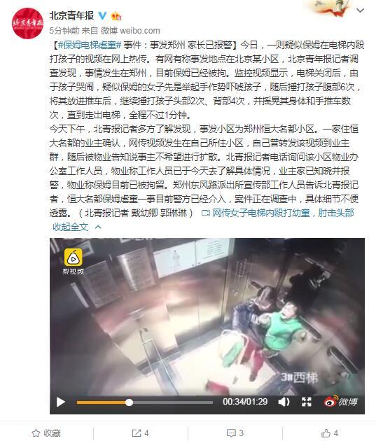 今日,一則疑似保姆在電梯內(nèi)毆打孩子的視頻在網(wǎng)上熱傳。有網(wǎng)有稱事發(fā)地點在北京某小區(qū),北京青年報記者調(diào)查發(fā)現(xiàn),事情發(fā)生在鄭州,目前保姆已經(jīng)被拘。監(jiān)控視頻顯示,電梯關(guān)閉后,由于孩子哭鬧,疑似保姆的女子先是舉起手作勢嚇唬孩子,隨后捶打孩子腹部6次,將其放進推車后,繼續(xù)捶打孩子頭部2次、背部4次,并搖晃其身體和手推車數(shù)次,直到走出電梯,全程不過1分鐘。